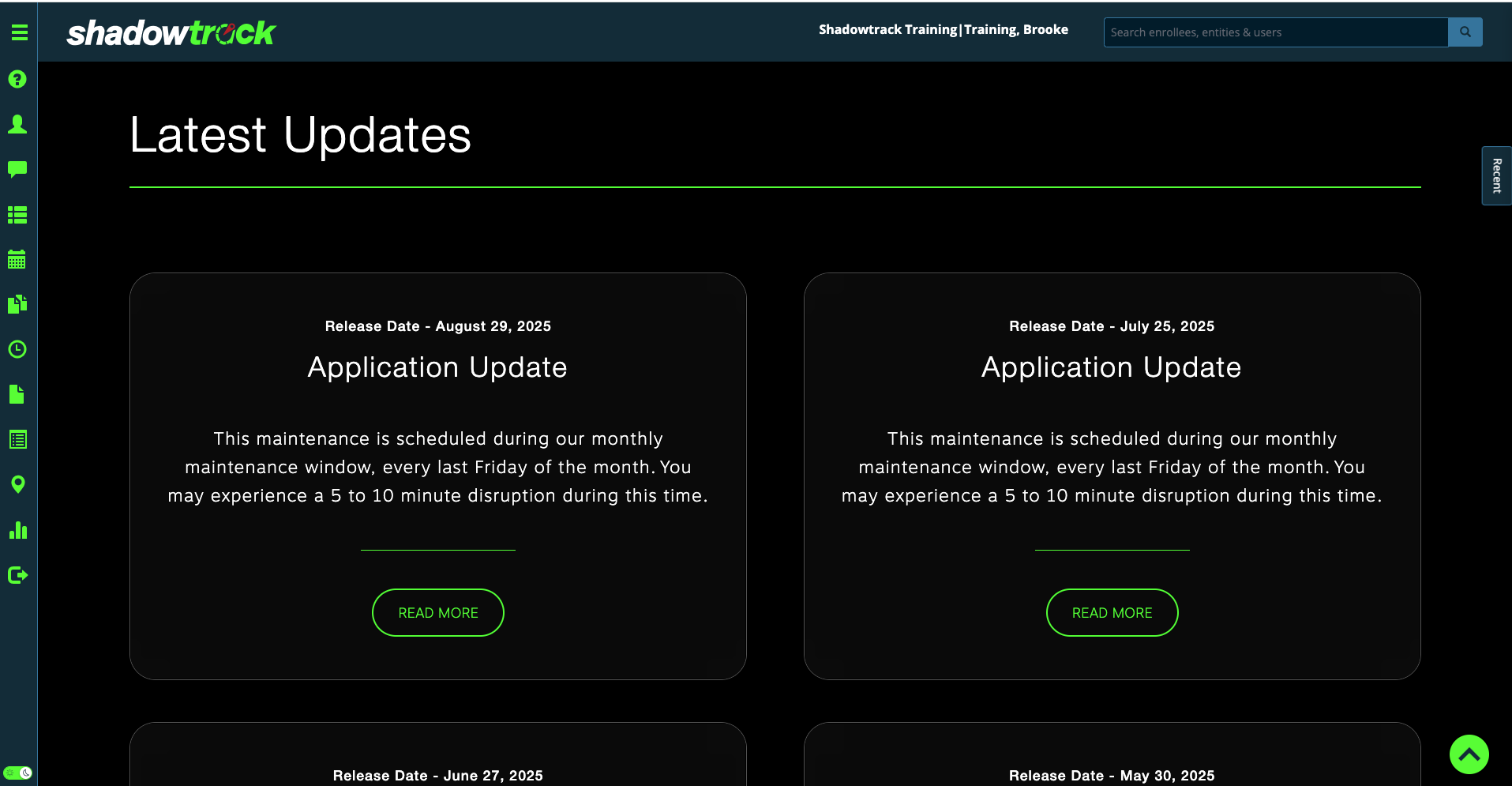When application updates are implemented within the ShadowtrackONE platform, a flag is displayed to indicate new releases. This flag can be found at the top of any page within the platform and is titled "See What's New". By clicking this flag, you will be redirected to the "Latest Updates" page, which displays the last four monthly updates, including the release date. Selecting the "Read More" button will open a new tab to the "Application Production Release" page. This lists all new updates, improvements, and bug fixes after each production release.